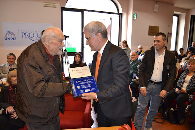 Qui sotto, il momento in cui il Poeta Mondelli riceve l'ambito premio dalle mani del Sindaco di Limbiate Antonio Romeo.